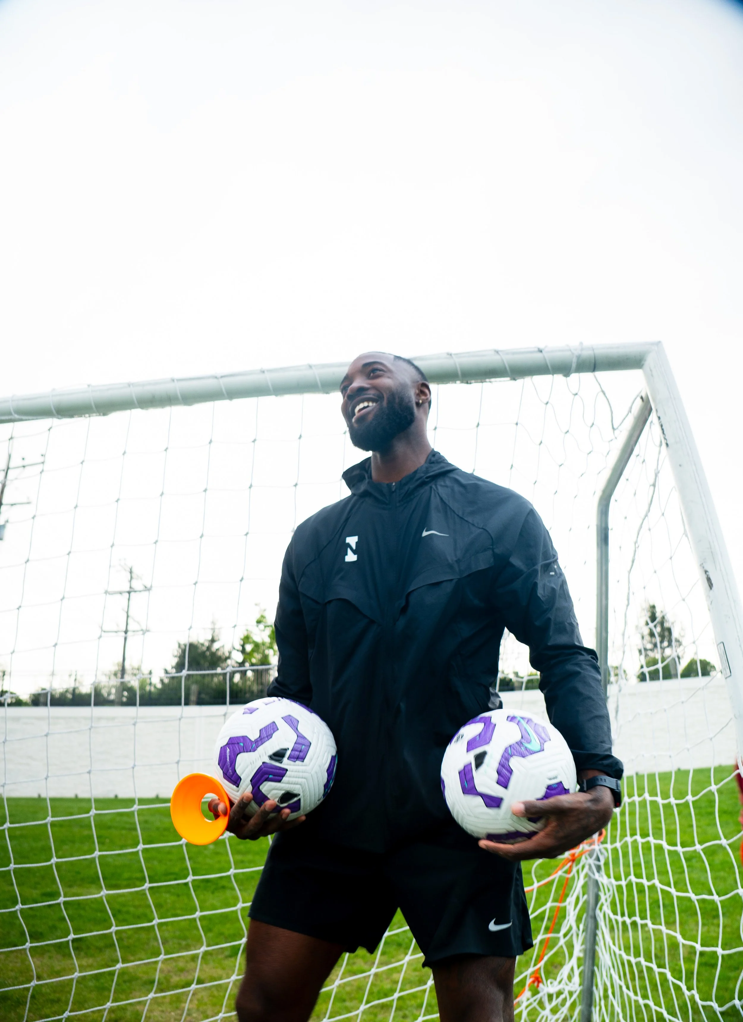 Male soccer player standing in front of soccer goal, holding two purple and white soccer balls, smiling.